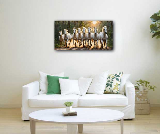 A Feng Shui painting of 8 White Horses with a Rising Sun is ideal for the East direction, symbolizing new beginnings, vitality, and success. The eight horses represent wealth, power, and momentum, while the rising sun signifies a fresh start and positive energy. Together, they encourage progress, ambition, and career growth, making this artwork perfect for attracting prosperity and energizing your space.