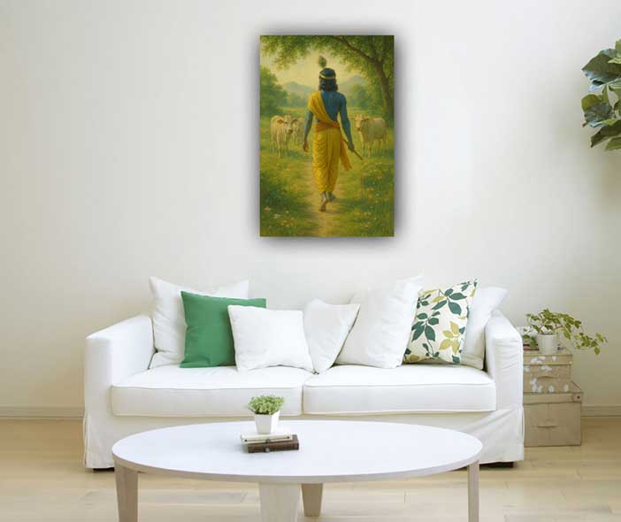 In Vastu Shastra, placing a Lord Krishna painting in the home is believed to bring peace, harmony, and prosperity. His presence is said to dissolve negativity and promote love in relationships, especially when shown with Radha. The calming image of Krishna playing the flute is known to attract good vibrations, mental clarity, and emotional healing.