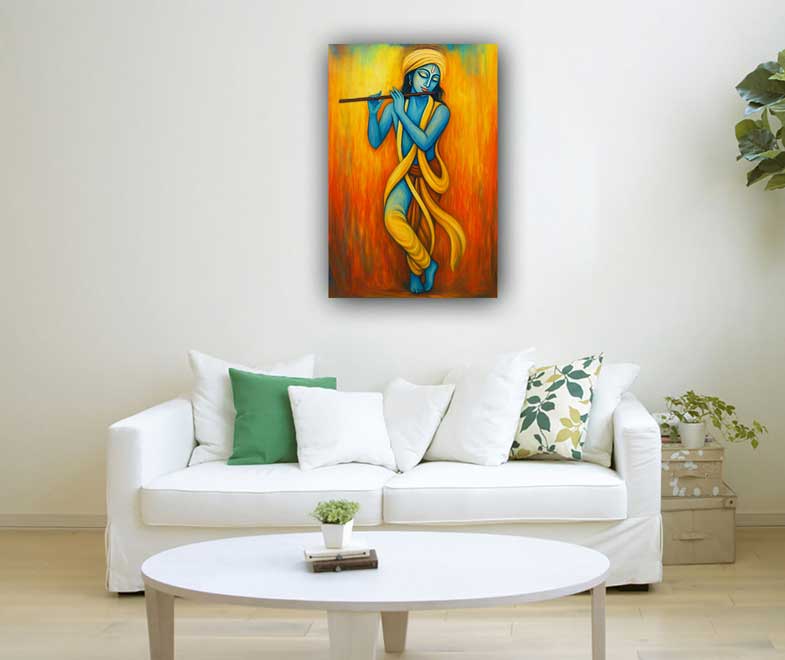 An abstract painting of Lord Krishna standing gracefully with crossed legs combines divine beauty with modern artistry, symbolizing love, peace, and joy. In Vastu, such paintings are considered auspicious as they attract positive energy, harmony, and prosperity while adding a serene and elegant touch to any space.