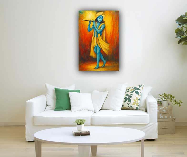 An abstract painting of Lord Krishna standing gracefully with crossed legs combines divine beauty with modern artistry, symbolizing love, peace, and joy. In Vastu, such paintings are considered auspicious as they attract positive energy, harmony, and prosperity while adding a serene and elegant touch to any space.
