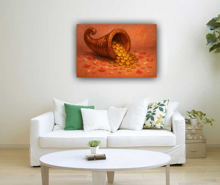 A timeless vastu Cornucopia canvas painting crafted to invite wealth and good fortune. This elegant canvas wall art uplifts interiors while supporting prosperity energies.
