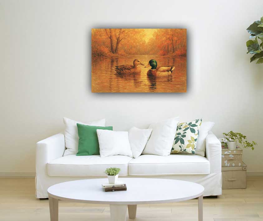 This Duck Painting is a Vastu-inspired artwork meant to bring stability, family bonding, and harmony when placed in the Southwest direction. The pair of ducks symbolizes trust, companionship, and grounding energy, ideal for strengthening relationships. Crafted on premium canvas with high-definition printing, it enhances your interiors while aligning your space with positive vibrations. Suitable for living rooms, bedrooms, or offices, this wall art blends tradition with modern décor.